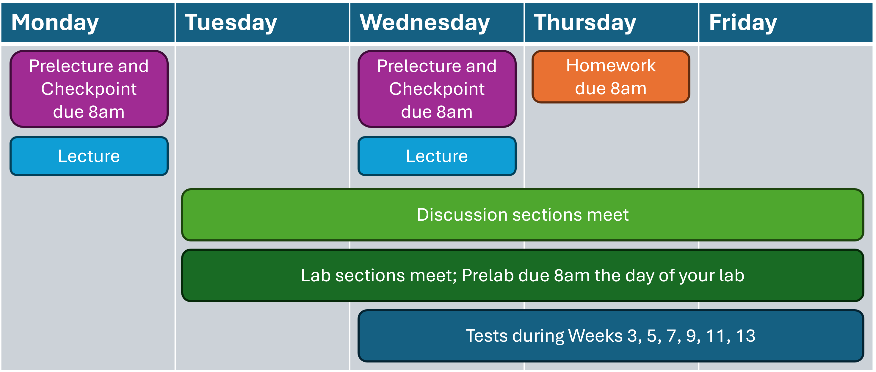 | Date | Prelectures | Checkpoints | Lectures | Labs | Discussions | Homework | Exams |