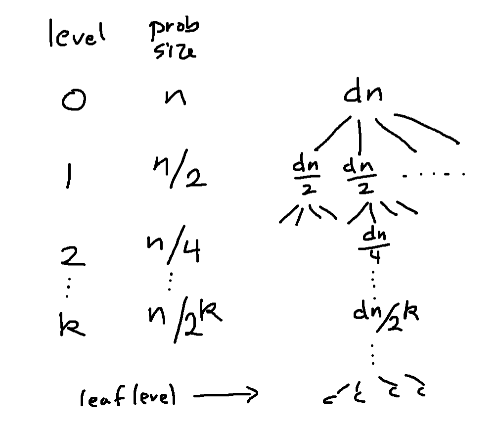 The next level shows the first layer of recursive calls. The problem size is now n/2. Because this extra work term depends on n, it shrinks proportionately to dn/2. (When the extra work term is a constant, it doesn't shrink.)