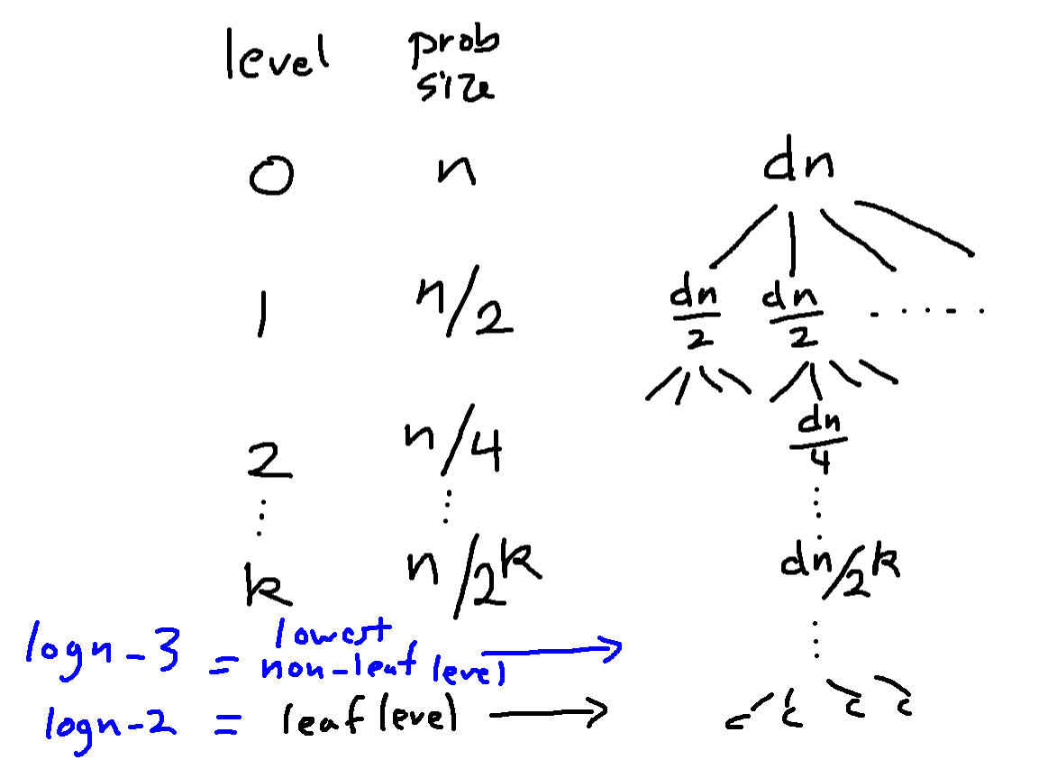 It's easiest to solve for the leaf level. We also need the level right above the leaves, i.e. the last level that contains these \(dn/{2^k}\) extra work terms. This is one less than the leaf level, i.e. level \(k = \log n - 3\).