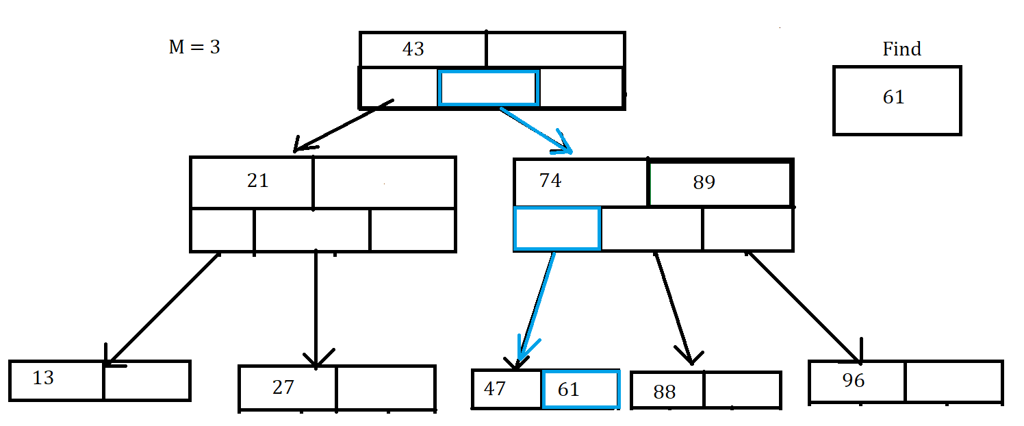 In this one we can see that we start in the root and follow the path of blue arrows and boxes to find the correct value. Even though it’s not shown in this picture,remember to go through the array of keys for the nodes you go through