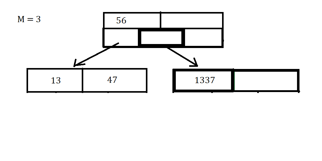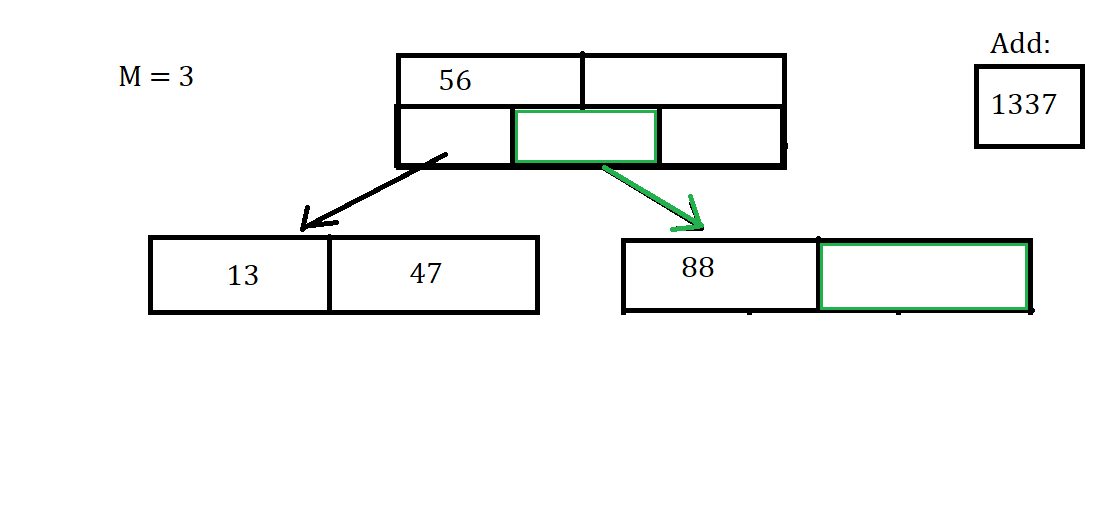 Let’s say we want to Insert the key of 1337. Then we first have to find the correct node, and see if there is space for the Insertion of the data.