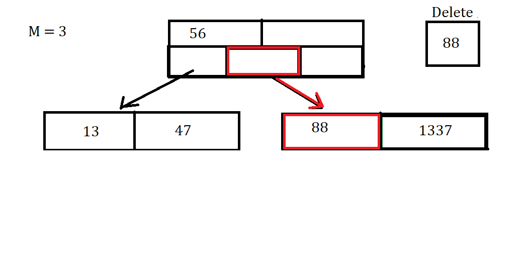 Uh-Oh that node is Full, So Now we have to throw the value of 86 up to the parent Node since it is the middle value, between the values of 56 and 88. Since that was the middle value thrown up and 88 is greater than 86, we put 88 into the (i+1) child node which was initially empty, where i is the index of 86 in the parent node.