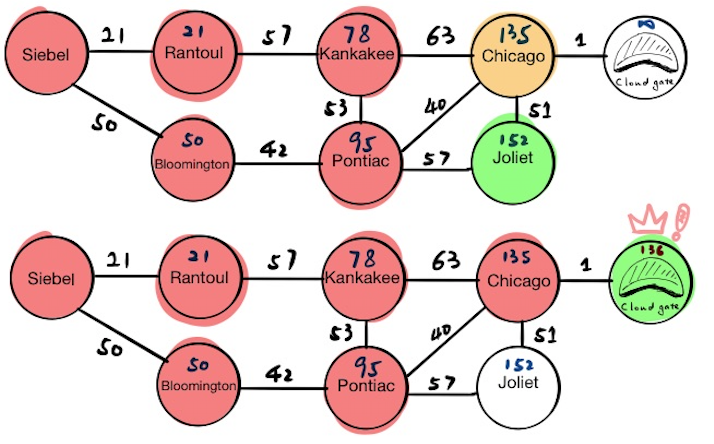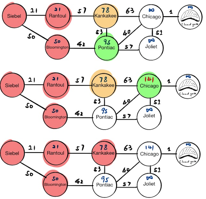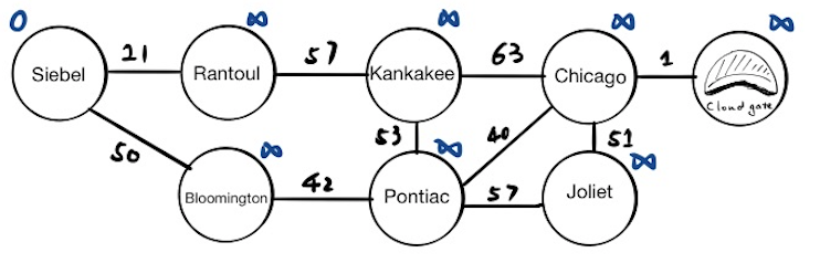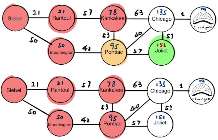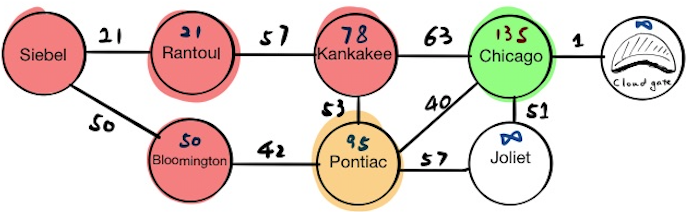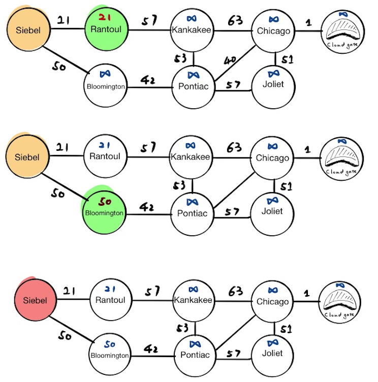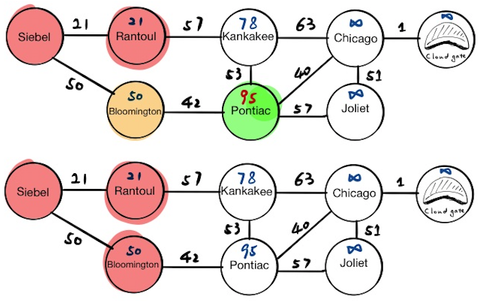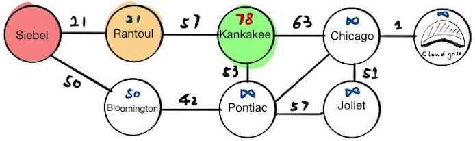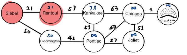 The first stop is Siebel, which has two neighbors, Rantoul and Bloomington. We will update their tentative distance values respectively and push the results into the priority queue. If we pop everything from the priority queue now, we will get: