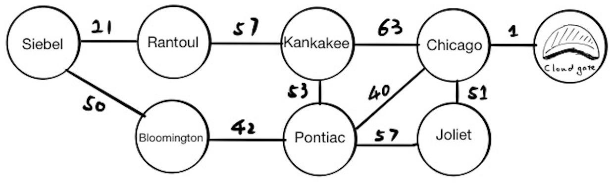 In this problem, each node represents the city we may travel to, and each edge represents the time(in minutes) traveling between two cities. The starting node is “Siebel,” the destination node is “Cloud Gate.”
