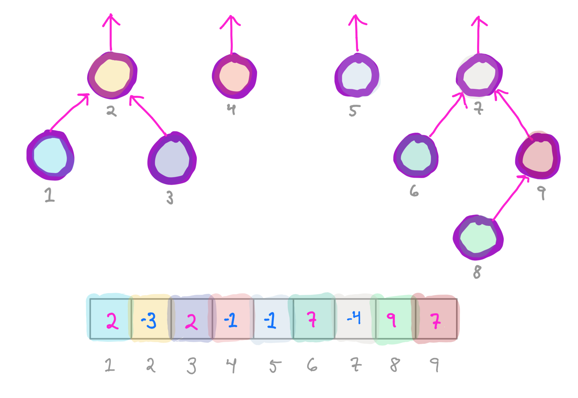Disjoint sets can be implemented as arrays in which negative numbers indicate that they are representatives and positive numbers are pointers to their parents.
