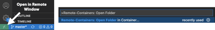 Using the Dev Containers extension on VSCode, run the command Open Folder in Container. You can do this by either clicking on the bottom left-hand corner widget (the green X-shaped button) or by pressing F1 (or Ctrl+Shift+P) and typing in the command.