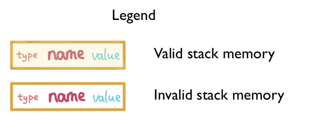 The following figures show examples of what stack memory looks like when the corresponding code is run: