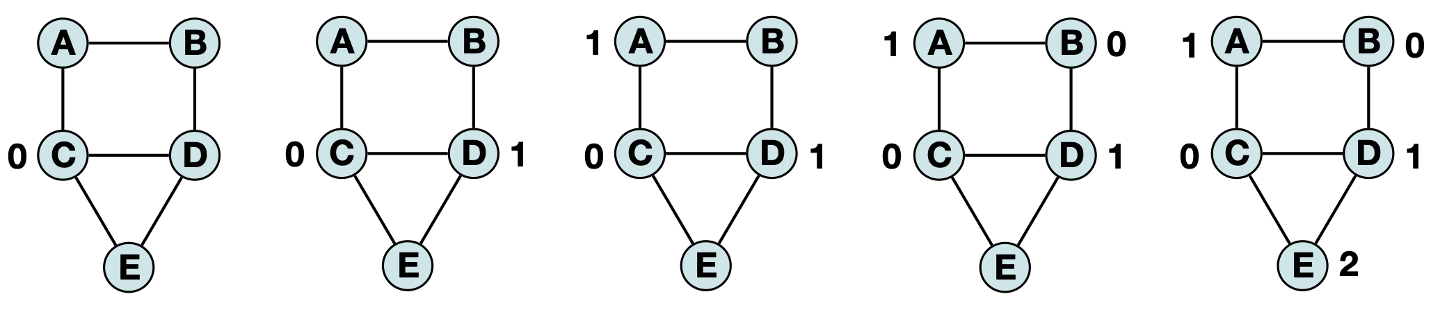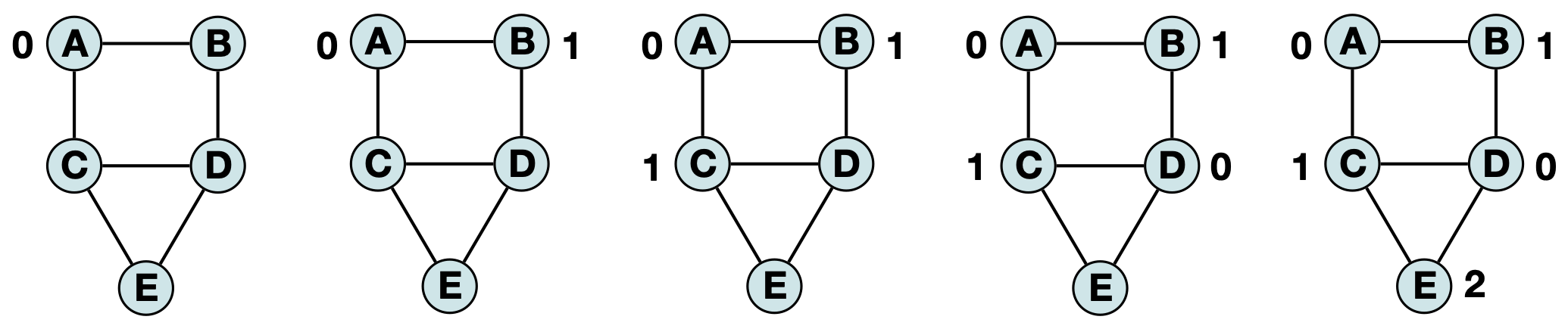 For example, if we ‘visit’ vertices in alphabetical order (A, B, C, D, E) then the heuristic will produce the following labeling (we often represent colors by numbers for convenience):