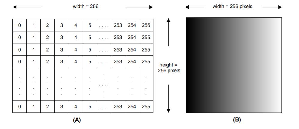 In the figure below - Values in the grid represent the grayscale intensity of the image on the right. A) Intensity values shown in a grid of same dimension as image. B) Image as seen on monitor