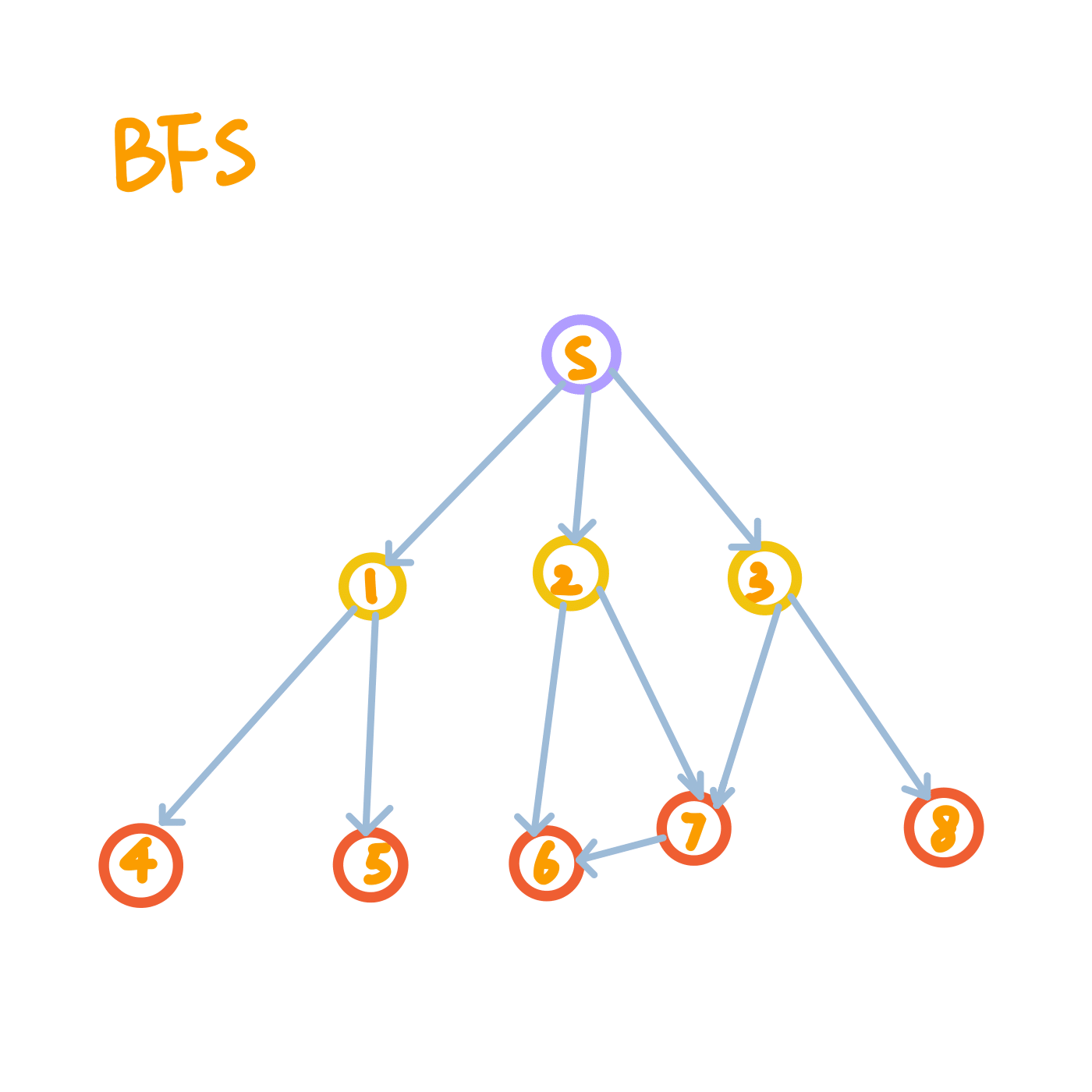 The central idea of breath-first search is to search “wide” before search “deep” in a graph. In other words, BFS visits all the neighbors of a node before visiting the neighbors of neighbors. Because of this order of traversal, BFS can be used for finding a shortest path from an arbitrary node to a target node.