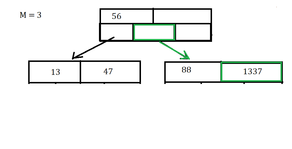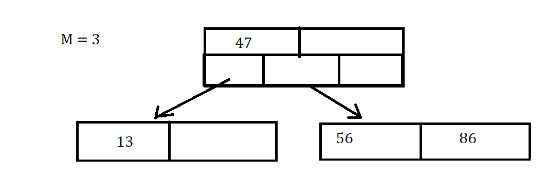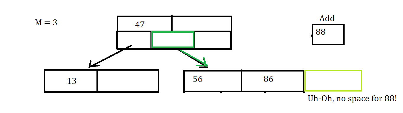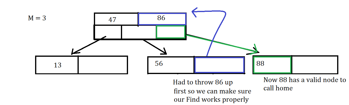 Uh-Oh that node is Full, So Now we have to throw the value of 86 up to the parent Node since it is the middle value, between the values of 56 and 88. Since that was the middle value thrown up and 88 is greater than 86, we put 88 into the (i+1) child node which was initially empty, where i is the index of 86 in the parent node.