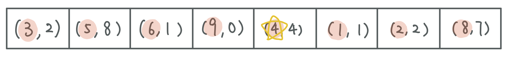 Partition the array so that every point with x coordinate smaller than 4 is on the left side of (4, 4), and every point with x coordinate larger than 4 is on the right side of (4, 4).
