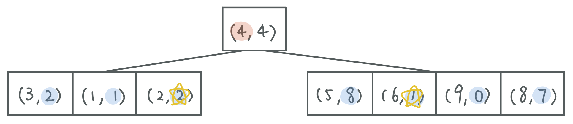 (4, 4) is the median in terms of x coordinate, make it our subroot.