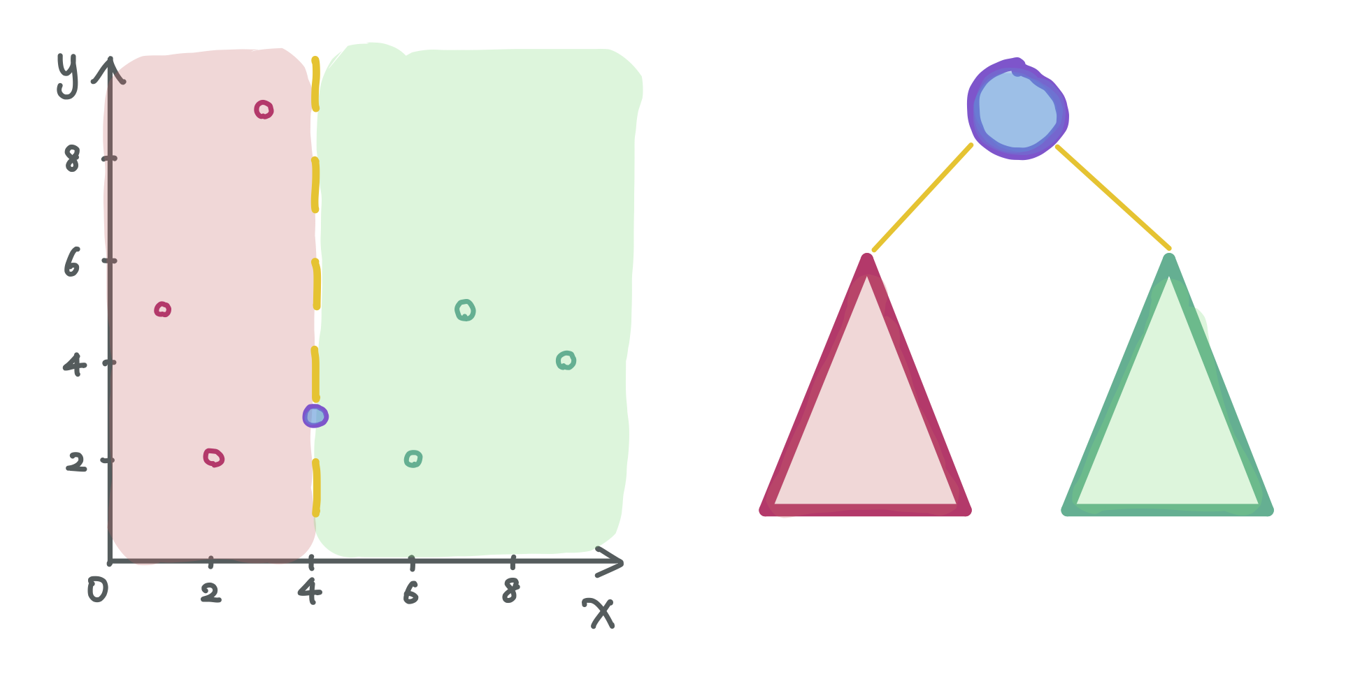 This is an example of k-d Tree storing points in 2D. Each node on a odd level splits the x dimension, and each node on a even level splits the y dimension.