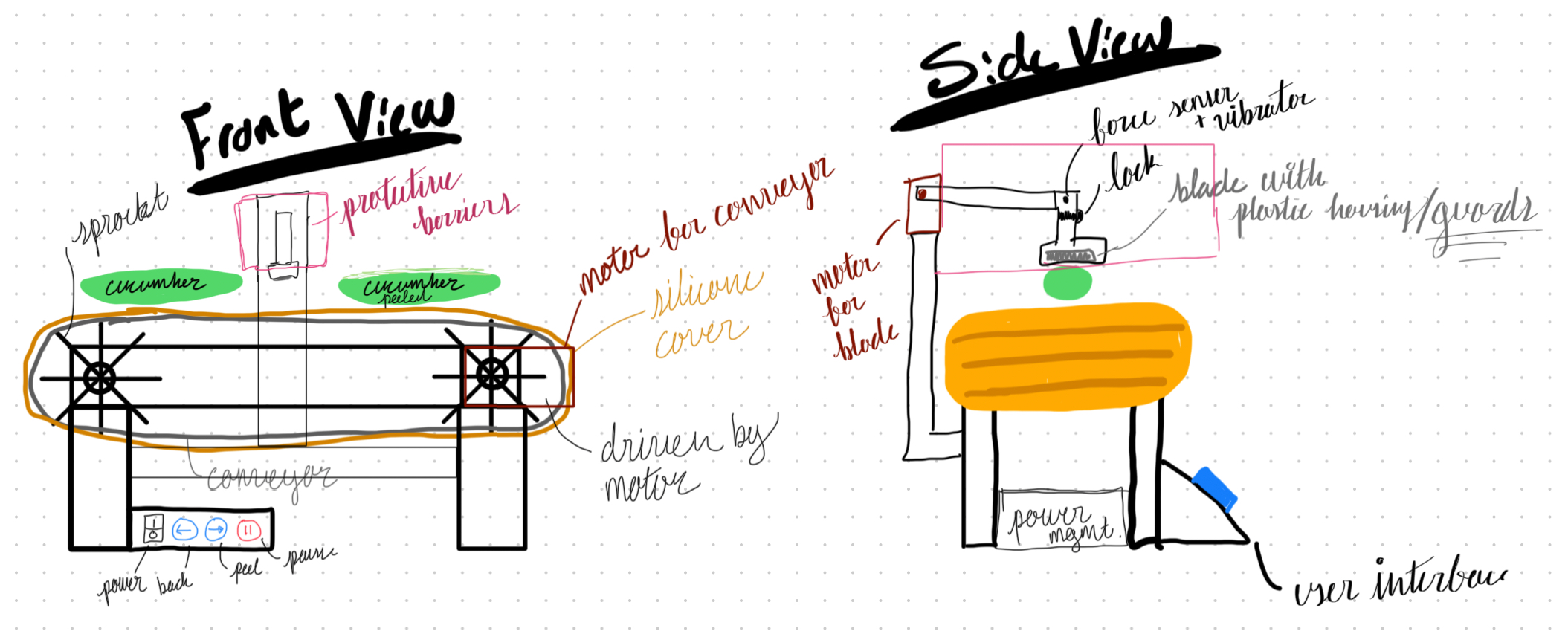 | Team Members: - Saathveek Gowrishankar (sg59) - Varun Ramprakash (varunr6) - Hyun Jun Paik (hpaik2) # Problem Traditional peelers require grip strength and fine motor control to properly and safely operate. Older adults and other individuals with limited fine motor control, arthritis, tremors, or reduced grip strength often find peeling fruits/vegetables difficult and unsafe. Meal preparation is widely classified as an instrumental activity of daily living (IADL), and the inability to consistently prepare meals can diminish one's independence and quality of life. Several recent papers highlight the lack of availability for assistive technologies for kitchen-related tasks. One paper (MORPHeus: a Multimodal One-armed Robot-assisted Peeling System with Human Users In-the-loop) even explores a fully autonomous robotic arm that peels vegetables with no human intervention. This solution, however, would be expensive, large, and unrealistic for home kitchens. Additionally, several studies highlight that older adults are less likely to use fully automated solutions and instead prefer semi-autonomous assistive technology that they can reasonably control. # Solution We propose a semi-autonomous peeling assist robot that can solve many of the aforementioned challenges while avoiding many of the disadvantages of existing proposed solutions. Our proposed solution consists of two primary mechanisms: a motorized conveyor belt and an actively compliant lever arm. Users place a vegetable on the conveyor belt which can then move the vegetable underneath and across a peeler; the conveyor belt is controlled by three buttons: one for each direction and one to stop. The actively compliant lever arm is fitted with a pressure sensor, a vibration motor, and a vegetable peeler; this allows the peeler’s position to adapt to variations in vegetable shape and position while maintaining a consistent depth of peeling. To ensure continuous and reliable power without runtime limitations, the device will be designed to operate on AC power using an external low-voltage DC adapter. To ensure ease of use, all food-contact components will be removable without tools and easily cleaned. The peeler will be held in place on two rails with a plastic swivel lock at one end, and the plastic conveyor belt will have a removable food-safe silicone/TPU outer layer that clips on; this allows the peeler and conveyor belt cover to be secure when in use but also effortlessly removed for cleaning. LEDs will be included to signal the state of the device (on/off) and the state of the conveyor belt (forward, reverse, paused). # Solution Components ## Subsystem 1: Conveyor Belt This subsystem controls the movement of the vegetable with constant speed, pulling it underneath the peeler blade. The vegetable is peeled lengthwise. Cylindrical vegetables (e.g., zucchini or carrots) are placed on the conveyor belt with their long axis parallel to the belt direction. As the belt moves forward, the vegetable is drawn longitudinally across the blade, allowing the blade to remove peel along the length of the vegetable surface. A single motor rotates the conveyor by rotating the drive roller through a sprocket and chain transmission. The belt is constructed from plastic and covered by a layer of food-grade silicone. The silicone layer attaches to the plastic belt and can be easily attached and removed for cleaning. - 12V Stepper Motor MEDIUM bipolar - ROB-09238 - Stepper Motor Driver – TB6600 ## Subsystem 2: Blade Holder: Pressure Detector with Vibration Motor This subsystem applies a controlled peeling force to the vegetable using a spring-loaded blade holder with motor-adjustable position, while simultaneously measuring the applied force using a load cell. A TAL220B straight-bar load cell measures the normal contact force applied by the blade. The load cell output is amplified and digitized by an HX711 load cell amplifier, allowing the microcontroller to read and record the applied force. The MG996R servo motor actively allows the blade to sense variations in the vegetable surface and adjust the motor accordingly in real time, maintaining continuous contact with the same force applied to the vegetable. To improve peeling, a mini vibration motor (Adafruit 1201) is mounted near the blade holder. The vibration helps the blade slide through the skin more smoothly without increasing applied force. Control Loop: The MG996R servo will be updated at approximately 50 Hz based on load cell feedback. Target Force Value: Initial target normal force is ~1–2 N, which is sufficient to peel typical vegetables like zucchini, carrot, and potato. We will experiment with these values to find the best-performing force. Control Algorithm: We will use a threshold-based incremental adjustment: if the measured force is above the target range, the servo retracts slightly; if below, it advances. This approach is simpler than PID and sufficient for the semi-autonomous design. Force Range Variation: Peeling force varies with vegetable type and skin toughness. Some papers indicate forces between 0.8 N and 2.5 N are generally effective for common cylindrical vegetables, but again, we'll have to test this. - SparkFun Load Cell (5kg, Straight Bar) – TAL220B - SparkFun Load Cell Amplifier – HX711 - Servo Motor – MG996R - Adafruit Vibrating Mini Motor Disc – ID: 1201 ## Subsystem 3: User Interface: Conveyor Direction Push Buttons This subsystem provides a simple, reliable manual control interface to move the conveyor belt forward or reverse. The main purpose is jamming recovery. If a vegetable binds against the blade, the user can reverse the belt to free it from the contact, then resume forward motion. LEDs will be included which indicates the state of the conveyor belt direction. For safety, the peeler will only vibrate when the device is in the peel state, not in the pause or reverse state. Additionally, clicking any button (including reverse) during the peel state will 