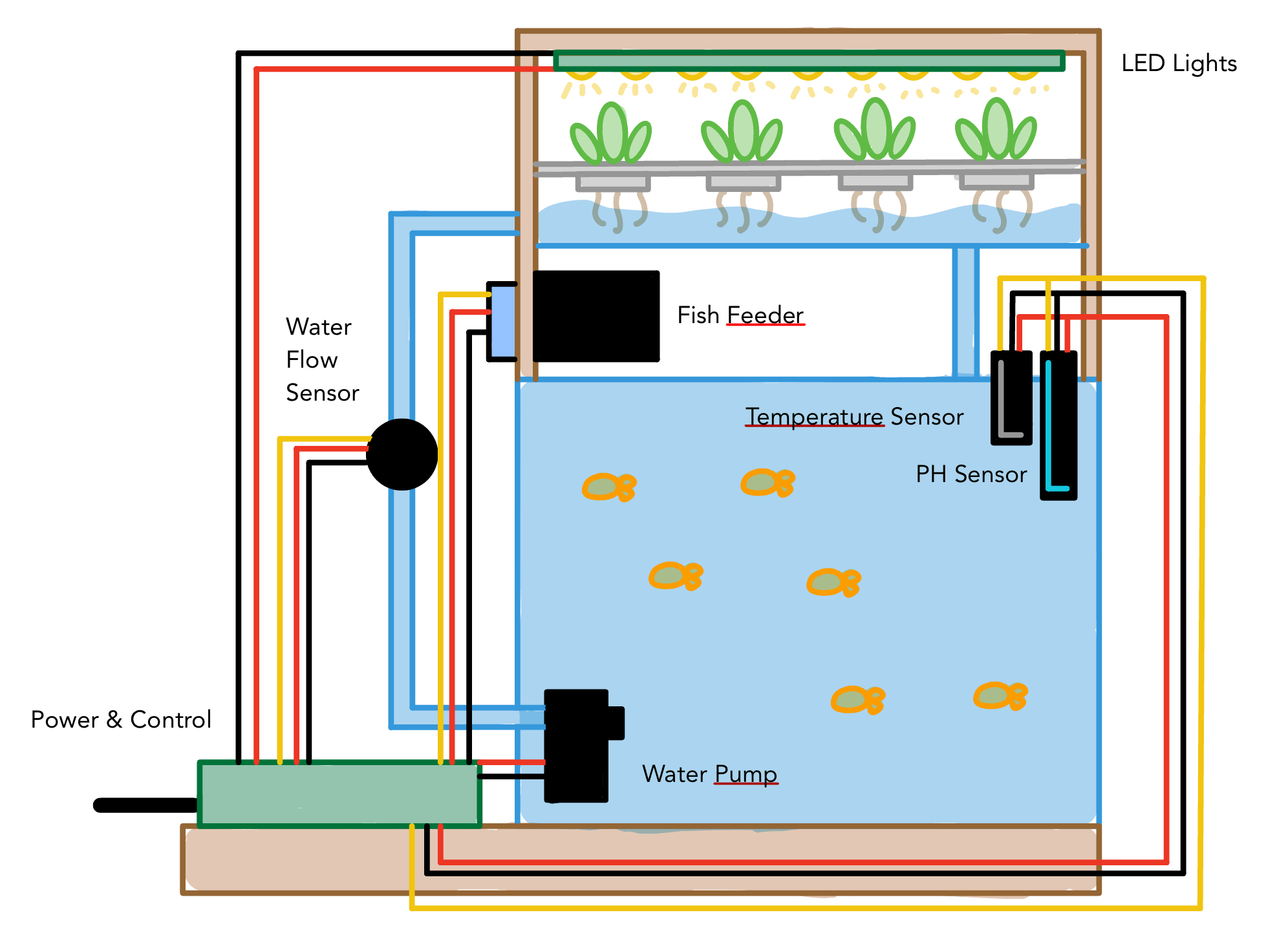 | # Circle of Life: Automated Desktop Aquaponics System # Team Members: - Aishwarya Manoj (am133) - Anjali Aravindhan (anjalia2) - Estela Medrano (estelam2) # Problem Urban living and limited indoor space make it difficult for individuals to grow fresh produce sustainably. Aquaponic systems offer an efficient solution by combining fish cultivation and plant growth in a closed-loop ecosystem, but existing systems require frequent manual monitoring and maintenance. Current desktop-scale aquaponics kits often lack intelligent control features and are cost-prohibitive for individual users. # Solution This project proposes the design and construction of a small desktop smart aquaponics system integrating automated environmental and fluid control. The system consists of a compact fish tank and plant grow bed forming a closed-loop water circulation path. An electronically controlled pump circulates water between the tank and grow bed, while a motorized dispensing mechanism provides automated fish feeding. A programmable grow-light module delivers controlled lighting cycles for plant growth. Embedded sensors monitor key system conditions such as water flow, ph level and water temperature. A microcontroller schedules feeding and lighting and processes sensor data. Depending on budget and difficulty, we may add more or less capabilities. # Solution Components ## Subsystem 1: Fish Feeder Subsystem A simple automated fish feeder will be implemented using an SG90 servo motor (linked below) operating between two angular positions, one away from the fish tank and another towards the fish tank for dispensing food. A custom 32-printed food container will be mechanically coupled to the servo shaft using screws and will include a small outlet opening that allows food to dispense when the container is rotated downwards. The servo motor will be controlled via PWM signals generated by a microcontroller. This microcontroller will also serve as the controller for the other subsystems. [https://www.digikey.com/short/0r42n3vv](url) ## Subsystem 2: Lighting Subsystem The lighting subsystem serves as the artificial light sources for plants in our desktop aquaponics system. The purpose of this subsystem is to make sure plants will get the correct amount of light and intensity per day to simulate growth due to sunlight from the Sun. The lighting subsystem will use LED colored lights with alternating blue and red colors to simulate sunlight and promote photosynthesis. We plan on using the Royal Blue and Deep Red ASMW-LL00-NKM0E LEDs from DigiKey (also linked below this section) connected to a LED driver to both control the lighting system and step down the input voltage of the PCB to the 3.08V needed by the lights. This LED driver will be in the same PCB as the microcontroller system and will use the same microcontroller. It will be mounted above the plants and the aquarium portion of the aquaponics system and shine down upon the plants. [https://www.digikey.com/short/zcmqv3wj](url) ## Subsystem 3: Water Quality Subsystem This subsystem monitors water quality through various sensors and allows for us to ensure that the aquaponic system is working properly. The three main components of this subsystem are the water flow sensor (314150005 from DigiKey), the water PH sensor (SEN0161 from DigiKey), and the water temperature sensor (Waterproof 1-Wire DS18B20 Digital temperature sensor) As we have a water pump pushing water up through our aquaponic system and bringing water to the plants above the fish tank, we need to measure the flow rate of the water to ensure that this component is operating effectively. The water flow sensor will thus measure the flow of water and ensure that the water is pumping effectively up the system. Alongside this, we will have a PH sensor to measure the PH of the water, which is critical for the health of both the fish and the plants. As we aim to have beta fish in the tank, that requires a PH of roughly 6.8 to 7.5, and we will have plants that require that slightly acidic to neutral PH range as well. If the PH is outside of this range, we will have a LED indicator (sourced from our component kit) so that the user knows it is time to change the water. Finally, we will have a sensor measuring the temperature of the water to ensure that it is habitable for the fish. Again, for beta fish this requires a temperature of 76 to 85 degrees Fahrenheit. The temperature sensor will measure the temperature of the water in the tank and if it is too high or too low, an LED indicator will be triggered, allowing the user to change the water or the temperature of their room. [https://www.digikey.com/short/r7f95h7j](url) [https://www.adafruit.com/product/381?srsltid=AfmBOop4JLBfv5qedUGq36frDQX9vyVTusMKieUlSaGwtCNAFJlJTlm4](url) [https://www.digikey.com/short/v9btn5d9](url) ## Subsystem 4: Power Subsystem The power subsystem’s main goal is to provide power to the other subsystems in this project, including but not limited to the lighting, fish feeder, water quality, and pump. To start the project will need an AC to DC 12V converter that is linked below. The voltages of the components will be the following: - The microcontroller unit, either a STM32- or a ESP32-class IC, requires 3.3 volts. For example, a STM32G4/F4 or a ESP32-S3. - The LEDs require a voltage of 3.08V and 200mA. - The water flow rate sensor requires an input voltage of at least 5V. - The PH sensor also requires an input voltage of 5V. The water temperature sensor’s power is between 3.0V to 5.5V. - The circulation pump ranges from 6V to 18V. - The water feeder servo uses 5V. Thus, we will be using a voltage regulator to step down the voltage from 12V to 5V for all of the systems, and a LDO to step it down to 3V for the LEDs. [https://www.digikey.com/short/dbfnfn48](url) [https://www.digikey.com/short/bf0mqfjh](url) [https://www.amazon.com/12V-Power-Supply-Adapter-Transformer/dp/B07DMFN2YN](url) ## Subsystem 5: Water Pump Subsystem The water pump