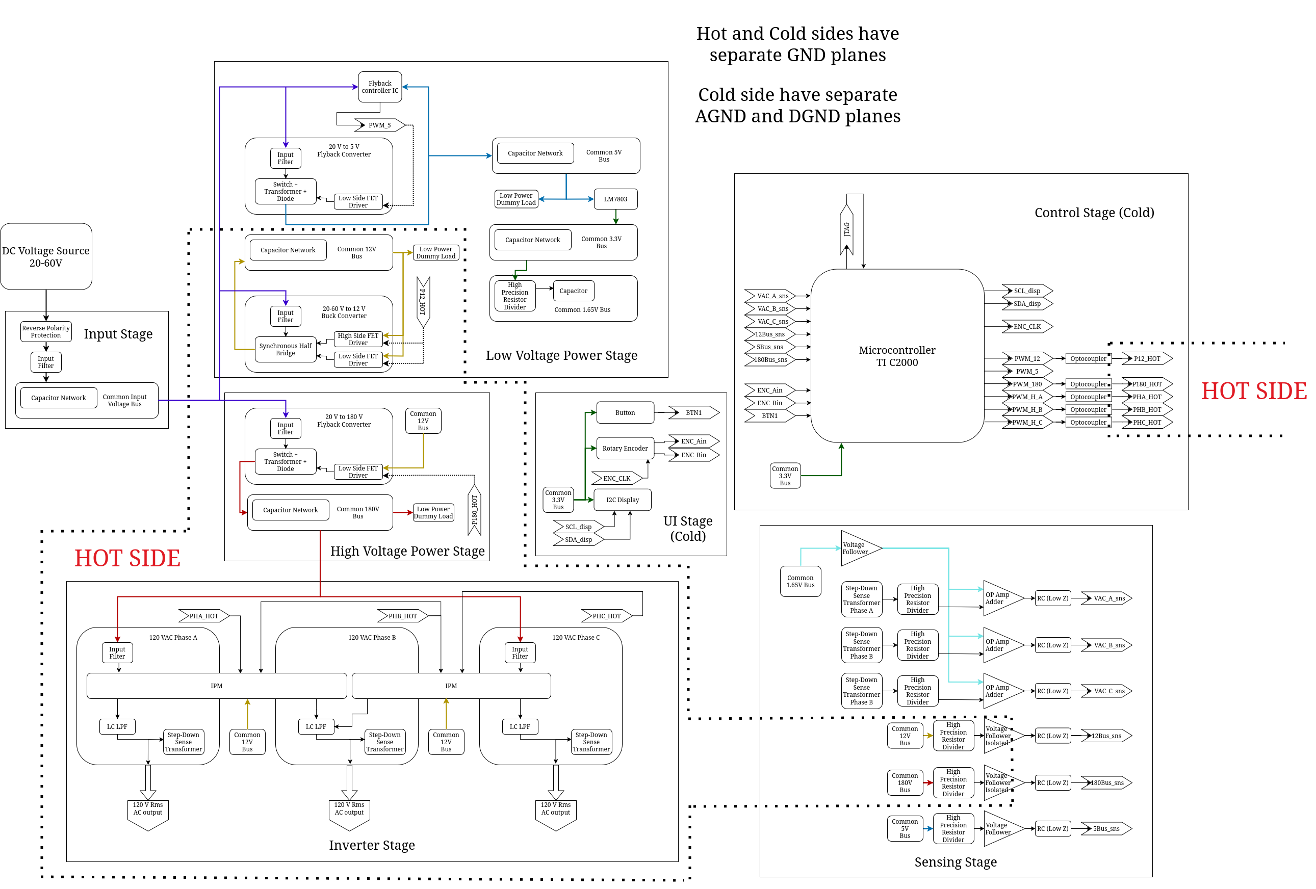 | # Controllable, User-Friendly 3-Phase Inverter Team Members: - Johnathan Vogt (jsvogt2) - Shyam Peden (speden2) - Alex Chirita (chirita2) # Problem While normal 3-phase AC power systems operate with consistent phase differences of 120 degrees, these systems are not always perfect. There may be occasions (fault conditions) where the power system becomes unbalanced. In order to test small machines under these conditions, one might want to create controllable AC waveforms with adjustable phase angles. # Solution We will create an inverter system that is capable of creating three AC waveforms with controllable phase angles. Phase A will serve as the reference 0 degree phase, while the B and C phases will be controllable with respect to this reference phase. This will be achieved using analog control, likely via potentiometers. The PCB will function as a normal 3-phase switching inverter, with switching control handled by the microcontroller, which takes input from analog signals to control the output AC waveforms. There will be 5 main subsystems : input stage with a boost topology, 3 MOSFET H-bridges, Encoder, CONFIRM button and small OLED Display as the user interface, and a TI-C2000 microcontroller as it has enough PWM channels and high resolution timers, whose firmware will include the user input control, and the power control for the bridge # Solution Components - Microcontroller TI-C2000 F2800157SPN - Rotary encoder PEC11R-4215F-S0024 - Button 320E11BLK - Display NHD-0420CW-AB3 - Power FETS G18N20T - Low side FET Drivers DGD0211CWT-7 - High side FET Drivers 1EDN7550BXTSA1 - Power capacitors (for bridges) - Low resistance resistors for shunts (Voltage, current sensing) - Connectors - Potentiometers for precision voltage division - Inductor cores - Copper wire - Linear voltage regulators for low-power IC’s (78xx Series) ## Subsystem 1: Boost Stage The main purpose of this project is the inverter stage, while the input is some sort of DC that mimics a solar panel. We will not focus on it being powered from a solar panel during the semester and leave it as a modification/addition to the inverter part for further development. The input voltage needs to be converted to a setpoint and fed into a common DC bus. This will be done with a half bridge boost converter. A good quality of this system is the freedom to choose which variables to control. The circuit will be able to respond to quick changes in input voltage, but this semester we will be using a constant DC power supply instead of a solar panel to reduce cost and complexity. Therefore the boost converter will be run by a switching algorithm with a fixed input voltage. Later the algorithm could be changed to an MPPT conversion if needed. ## Subsystem 2: H-bridges The bridge subsystem will contain three MOSFET H-bridges, each corresponding to one of the phases. Each of the phases will have a similar layout since the control is only achieved by the gate signal which is fully generated by the microcontroller. We decided to go with an H-bridge because it’s a good middle ground between multi-level bridges and a half-bridge. The H-bridge will allow us to generate a good quality sine wave when averaged out and filtered.The sine wave will be generated from -Vmax to +Vmax, and the sign will be decided by using a proper pair of MOSFETS from the 4 available. Each mosfet will have a corresponding low side or high side gate driver, which will receive their PWM control signals from the microcontroller. Each phase will have an LC low-pass filter at the end to reduce switching harmonics. ## Subsystem 3: User interface The user interface will consist of a display, encoder, and a confirm button. The user will use the encoder and confirm button to navigate the user interface where the phase angle will be set for phase B and C in relation to phase A, which is static. Users can also choose to use an autoset where the microcontroller will default to 120 degrees between each of the phases. ## Subsystem 4: Input control The microcontroller will run polling input from the button and encoders, run a loop which checks whether the phase is within bounds (-180 to +180 degrees with respect to phase A) and override the proper variables variables, which will be used by the switching subsystem as target phase angle. ## Subsystem 5: Switching control The constant loop will check the phase angle variables and calculate the expected voltage for each phase. It will then generate the PWM for each phase that matches the needed Vrms. The output voltage which first went into the resistor divider to fit within maximum operating voltage of the microcontroller will be collected as samples over the wave period, Vrms calculated and compared to the set Vrms after which the switching signals for each phase will be adjusted. # Criterion for success Our device will be considered successful if we can accurately display a 3-phase network on the oscilloscope. Each phase has to have the same amplitude and frequency as well as have the same phase angle between each phase as set by the user. Across all 3 phases the inverter should be able to output 0.83A of current (~100W) and each phase should be able to handle 0.33A (~40W). The output RMS voltage is 120V. |