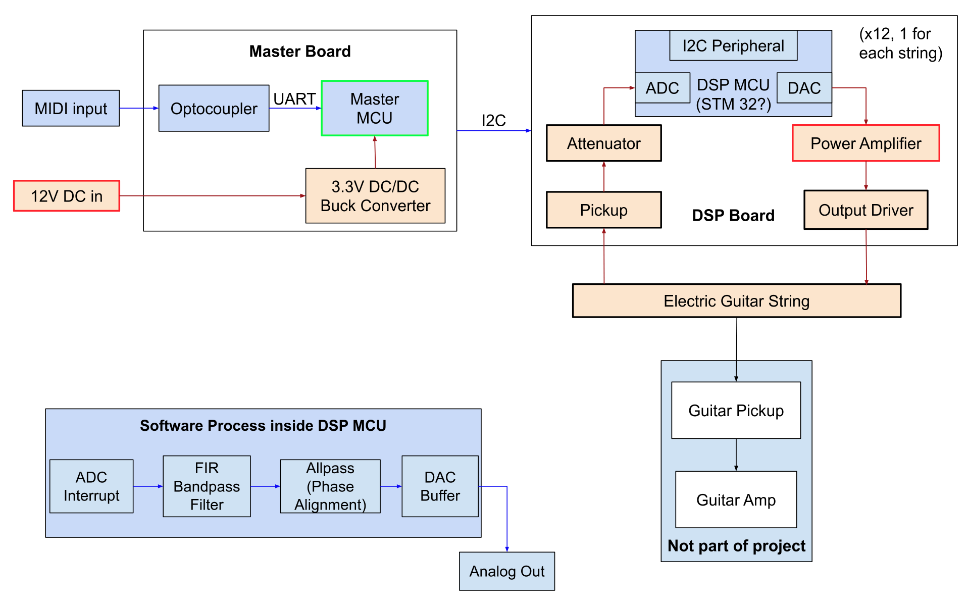 # Title: Transverse String Organ Team Members: - Eddy Perez (ekperez2) - Ash Huang (akhuang3) - Kellen Sakaitani (kellens4) # Problem Electric guitar feedback is traditionally produced by amplifying the signal from the instrument loud enough that the energy stored as sound can induce a sustained feedback loop in the guitar string. Products such as the EBow take this concept and remove the inefficiency of energy transmission through sound by instead sending the amplified signal through magnetic driver coils (think of speaker drivers) directly into the string. Products such as this implement harmonic controls through analog filters in the signal chain, causing the string to resonate in higher octaves. Techniques such as this create a unique timbre from this instrument which can be finely controlled by the player and the electronics of the instrument. This unique timbre is restricted to a small number of notes (1-6 strings) at any given time and can only be utilized musicians who are trained on guitar. # Solution Our team would like to bypass these restrictions by making a harp or organ-like instrument with one feedback system per string. This instrument would ideally consist of twelve strings representing the chromatic scale in either the first or second musical octave. Our instrument would be controlled over a MIDI interface, allowing it to generalize to a broad range of musical controllers for those with backgrounds in various instruments. The instrument would be comprised of two main systems: the Master Board and the individual DSP Feedback Systems. The Master Board will act as the host of the system; it will listen to a MIDI signal through the UART peripheral of an STM microcontroller, and translate specific MIDI commands to an I2C bus, where this system would act as the master. This board will also include a 3.3V DC/DC regulator to power the MCUs of the other boards of the system. On the slave side of the I2C bus will be several (1 per string) low-power, DSP microcontrollers. These microcontrollers will impelement the filtering that traditional sustain systems typically do using DSP rather than analog filters. This will allow us to perform extended functionality such as the automatic muting of notes, and more controlled harmonic filtering. These DSPs will be paired with an electromagnetic pickup (similar to that of an electric guitar) to sample a signal from the string as it vibrates, and an electromagnetic driver which will receive an amplified & filtered version of the original signal in order to induce feedback into the string. Each electromagnetic driver will be powered by a discrete class AB amplifier. We would like to use an off the shelf 12V DC power supply to power the entire system. # Solution Components ## Subsystem 1 The Master Board will be comprised of three parts: an optocoupler, the master MCU, and an integrated 3.3V DC/DC converter. The optocoupler will serve the purpose of reference isolation for the MIDI controller port. This is standard circuit design for a MIDI receiver and will require minor peripheral circuitry to perform tasks such as ESD protection and signal biasing. The master MCU will be a low power MCU, capable of basic communications such as an STM L0 / L4. Since the bandwidth requirement of this MCU is actually less than that of the DSP boards, we will likely use the same MCU as the DSP boards for cost optimization. In particular, we were considering the STM32 L431CB, the reasoning for which will be explained in the DSP section. The DC/DC regulator will likely be a TI TPS62903. We've decided to use an integrated regulator as the functional design of this type of circuit is not core to the working concept of this project. This IC has an input range of up to 17 Volts which aligns with the off the shelf 12 Volt power supply that we are hoping to use. This specific regulator has a sustained maximum current output of 3A, which significantly greater than the maximum current draw (140mA) for 13 of the MCUs above, although it is also important to note that these MCUs are not expected to draw nearly that much current as they will not be powering any peripherals. This IC is a QFN package which will require an SMD stencil and reflow soldering, however members of our team (Eddy Perez) have experience with BGA design and reflow soldering from prior classes. ## Subsystem 2 The DSP boards will be comprised of four parts: The MCU that we are hoping to use for both these boards and the Master Board is the STM32 L431CB. This MCU is a part of STM's low-power series of microcontrollers, and is likewise cheap and accessible which is important for scalability in a project that uses several of them. This MCU comes in a QFP package and therefore will be hand-solderable. Additionally, this specific MCU has an internal factory trimmed 16MHz oscillator, which is key to reducing the overhead circuitry needed for DSP. In the same vein, this MCU has a built in DAC which will allow us to directly drive amplifier circuitry rather than using PCM output and smoothing circuitry. While it is likely possible to process multiple concurrent channels of audio using this MCU, we would like to use 1 DSP per string to avoid any potential bandwidth restrictions or architectural complication when executing this design. Our choices regarding cost and scalability reflect this decision. The DSP boards will make use of two electromagnetic coils. The signal for each string will start at a pickup (similar to that of an electric guitar) localized to each specific string. These pickups will have an output impedance of roughly 10 kOhms which will enable them to directly drive the ADC pins of the DSP MCU. Again, this is a decision that was made to optimize the cost of the project. The output of these pickups can be attenuated passively using potentiometers for level matching. Potentially higher performance for this system could be achieved by using lower impedance pickups, and op-amp buffers before sampling. 