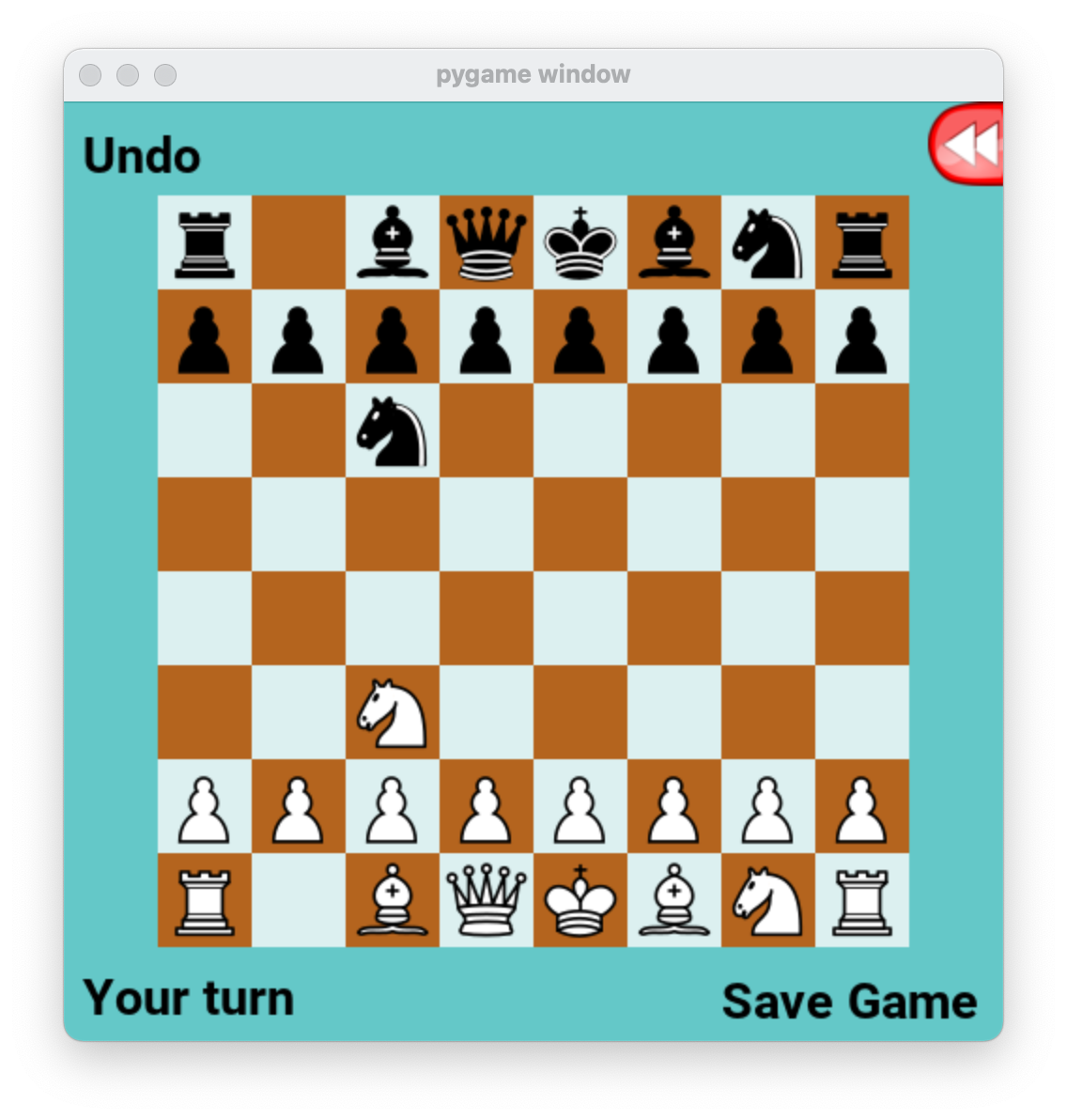 Test that it is working correctly by moving one of your knights forward. The computer should respond by moving one of its knights foward, as shown here: