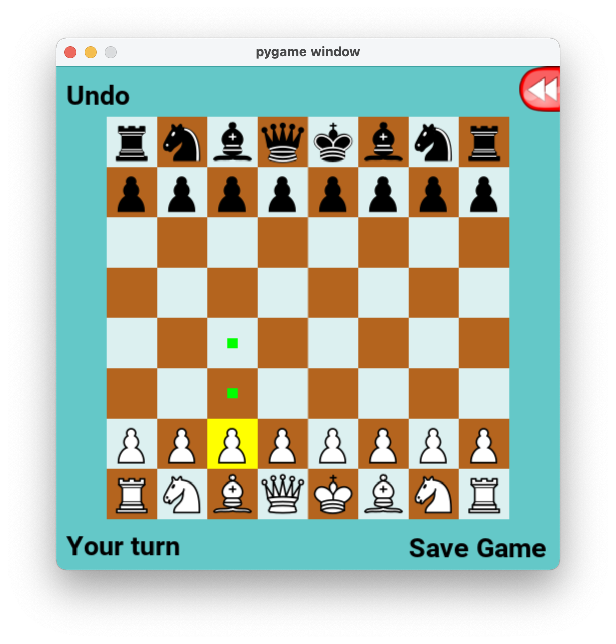 You should see a chess board pop up. When you click on any white piece (you may need to double-click), you should see bright neon green dots centered in all of the squares to which that piece can legally move, like this: