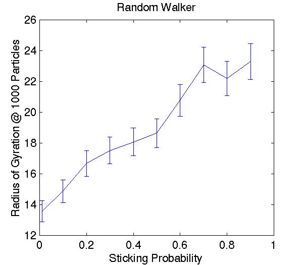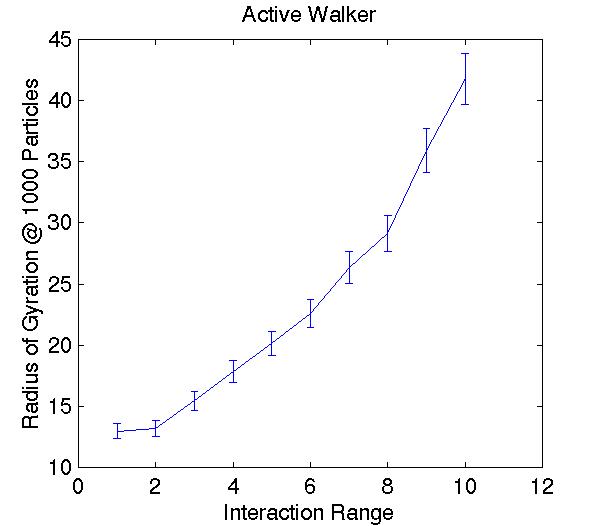 The active walker shows a more dramatic increase than the random walker. This follows directly from the trends in fractal dimension which indicate a more fibrous limit for active walkers. For a similar number of particles, the more fibrous pattern must have a large portion of its area farther from the centroid.