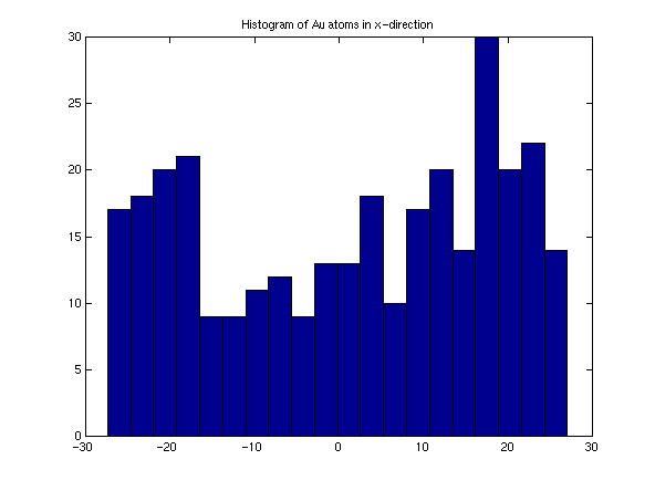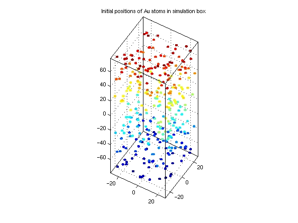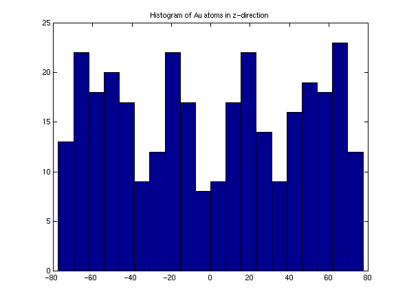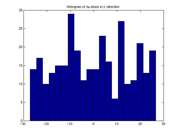 A 3D plot of the positions of the gold atoms in this lattice can be seen here: It can be seen from the following figures showing the distribution of gold atoms in this lattice in the 3 axis directions that inital distribution is homogenous. The initial lattices used in other simulations has the same distribution.