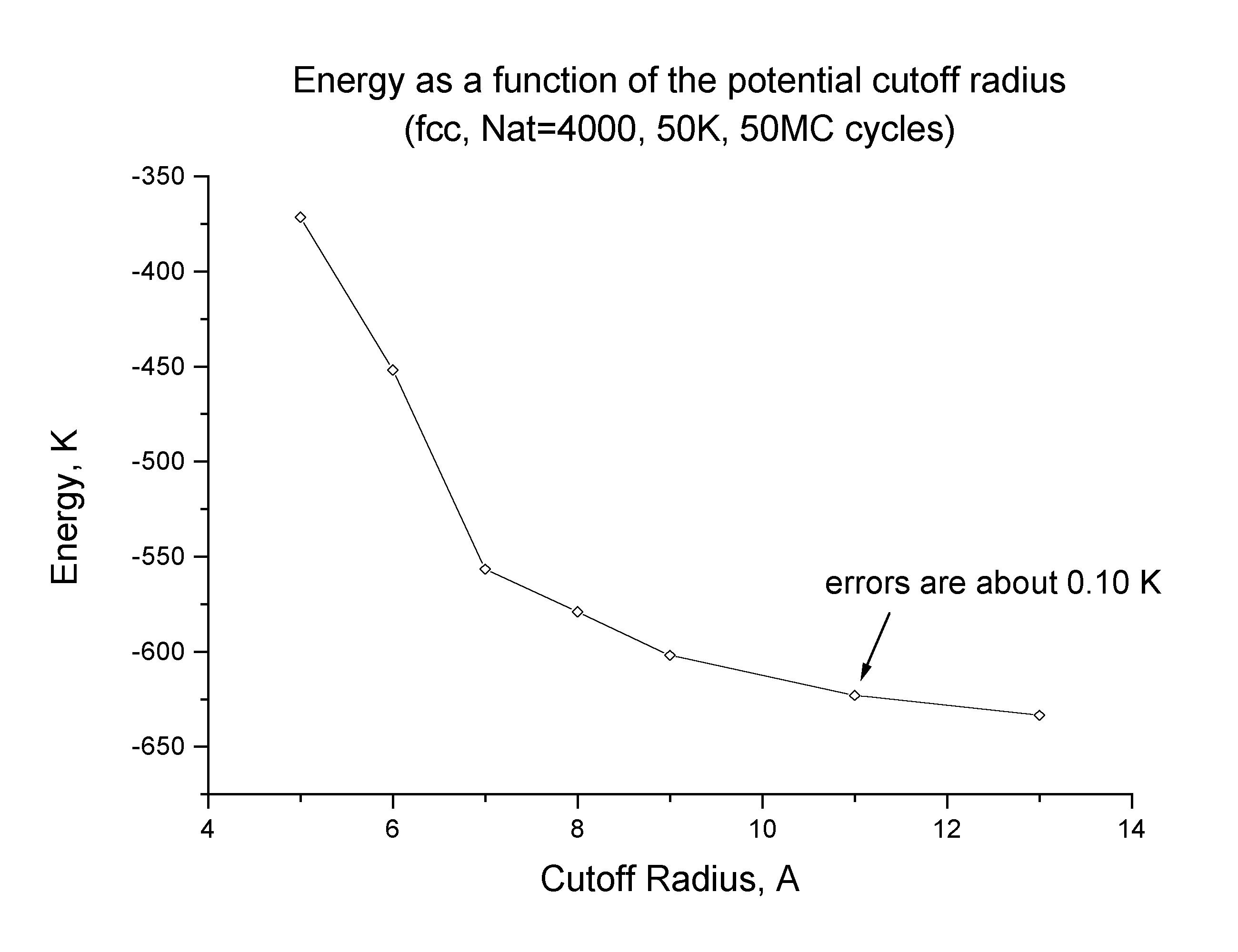 The simulation cell was taken to include 4000 atoms, large enough to reasonably eliminate unphysical correlation effects. The following plot shows the energy's dependence on the number of atoms in the simulation cell.