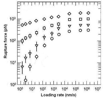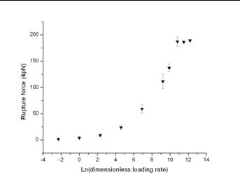 Figure 6 shows the average rpture forces as a function of the loading rates. The rupture force measured is an increasing function of the loading rate. At high loading rates, the rupture forces are comparable to the maximum force corresponding to the LJ potential.