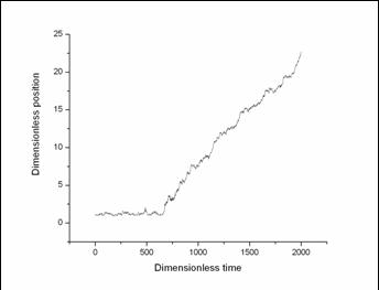 The Lennard-Jones parameters used were sigma= 1nm and epsilon= 5kT . Reduced units were used in our code for efficiency and easy analysis of the results. The timestep was constructed to be non-constant, depending on the proximity of the anchored molecule to the rupture distance. This is done such that the initial stages of the run are computes at larger steps which gets smaller as the rupture distance is approached. The random noise is supplied by a uniform random number generator (ran1, numerical recipes) and transformed by the Box-Mueller method algorithm (gasdev) which generates a random deviates of standard normal distribution. A variable transformation is then performed on each call x = x' times s where s is the desired variance of value s = sqrt(2Dt) in accordance with the random noise of the langevin equation.