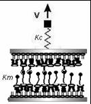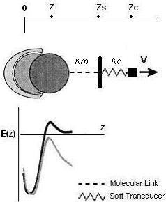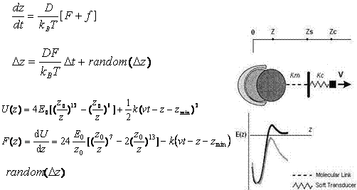 Where Hummer and Szabo have used a very simple potential for their study while comparing with the experimental unfolding of the titin molecule, we hereby decided to use the Lennard-Jones potential as the potential form of the inteaction with an effective spring constant (k=km + kc , as in Figure 3 below) to imitate the springiness and response of the molecule in a single molecular bond rupture experiment. They have made approximations in their calculations in order to avoid the complexity of the analytical solution for their simple model, while we are depending on computer simulations to scale the different regimes by a modification of the timestep of the simulation. We have also introduced a random noise in the system to imitate the brownian contribution of the local environment of a molecule to its motion.