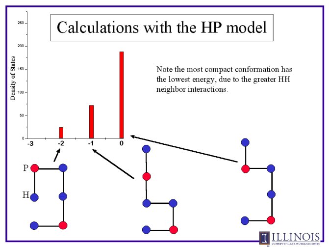 The standard exact model proposed by Dill [1],[2] is called the "HP nearest neighbor model". In this model, there are only two types of amino acids used: H for hydrophopic and P for polar. Proteins tend to arrange themselves such that the H are folded in on, and the P are at the interface with the water surrounding the molecule. The energy of the conformation is calculated by the nearest-neighbor interactions (NOT counting the interactions between bonded H and/or P, which are those linked together on the sequence chain). Usually, all are neglected except for H H which is -1. Such models are based on the experimental observation that conformations of real proteins almost always bury hydrophobic amino acids, keeping the polar monomers on the surface.