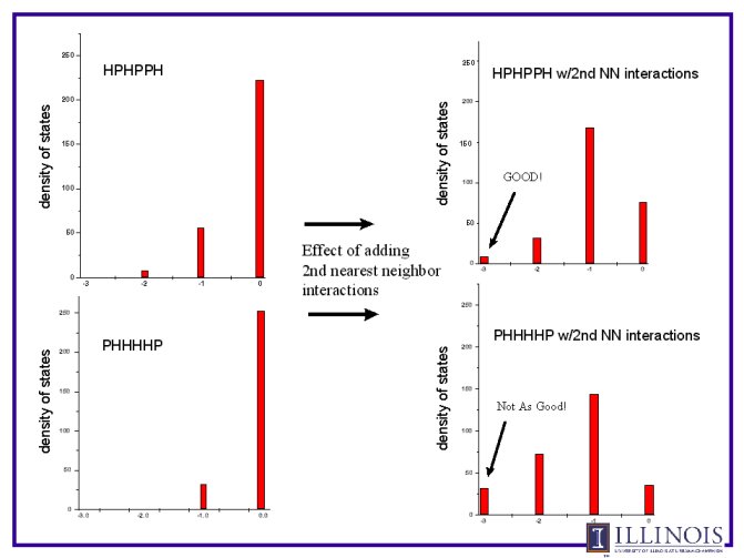 Note here that there are two different effects. One is the sequence of the protein only. the HPHPPH is a "better" protein than the PHHHHP, becuase it can both achieve a lower energy state, and has a lower degeneracy at that state.