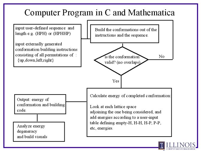 We wrote a computer program that calculates all possible conformations from a set of complete permutations of the moves up,down,left,and right. A possible conformation is one which does not try and put an amino acid on an already occupied site. Of the sucessful conformations, the energies are calculated for two situations: nearest neighbor only, and both nearest neighbor and second nearest neighbor interactions. Additionally, we enable up to four different amino acid types to be input in the sequence, and we have a user input table of the interaction energies between all of them to enable easy modification of the model.