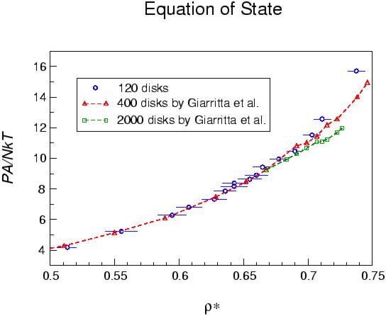 The equation of state is obtained by calculating the densities at different reduced pressures (P/kT). Figure 1 shows the results of our 120 hard disks system compared with constant-NVT simulations of larger systems[Giarritta et al., 1992]. The agreement is very well up to the density of 0.67. The discrepancy at higher pressures is most likely due to size effect, as explained by Giarritta. With a 2000 disk system and more extensive calculation of the isothermal compressibility(numerical differentiation of the EOS curve), they concluded that