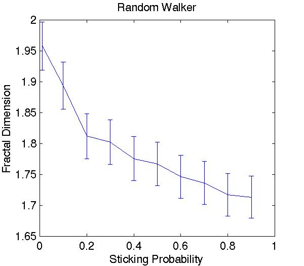 Both show the expected downward trend as the forms become more fibrous and open as well as the limiting value of 2 for the compact limit. As the interaction range is increased the landscape is depleted for a large distance around the growing dendrite. It is therefore favorable for the dendrites to be widely spaced and produce an open pattern.. Likewise, a high sticking probability allows particles to adhere quickly so produce a branched, open structure, while a low sticking probability allows much diffusion after primary impacts, producing a compact pattern.