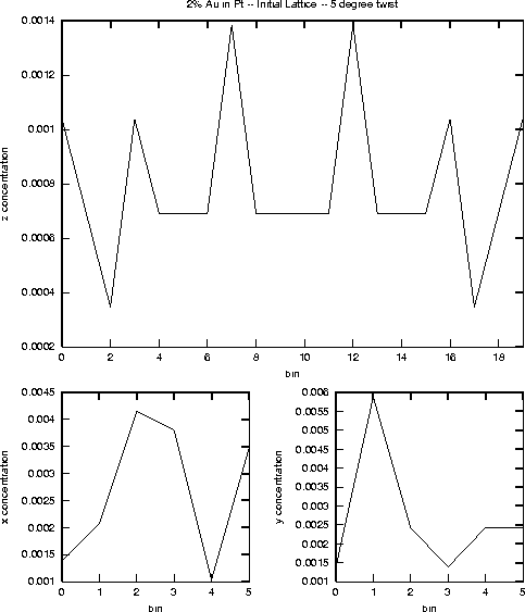 It is clear from these final concentrations that for T <= 300K the Au atoms do segregate. However, the do not migrate to the grain boundary (at bins 0,9, and 19). Instead, they segregate toward certain areas of the x-y faces of the simulation box. Due to the periodic boundary conditions applied in the twisted lattice, a few rows of vacancies are created. Thus the Au atoms are migrating to these vacancies instead of the grain boundary.