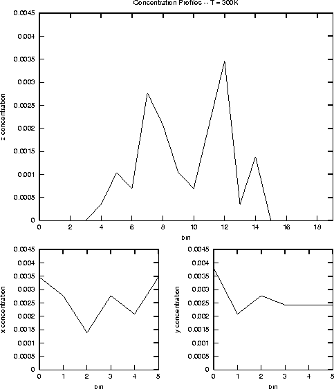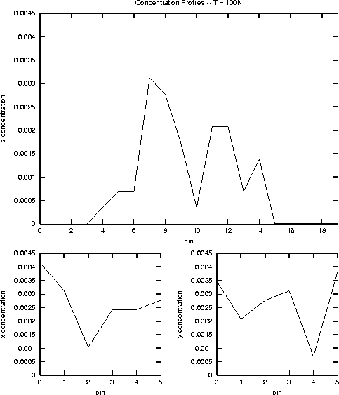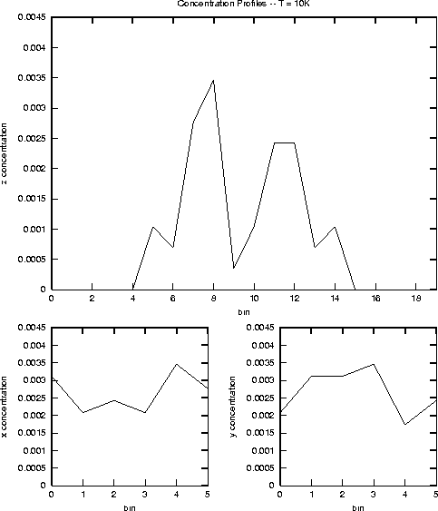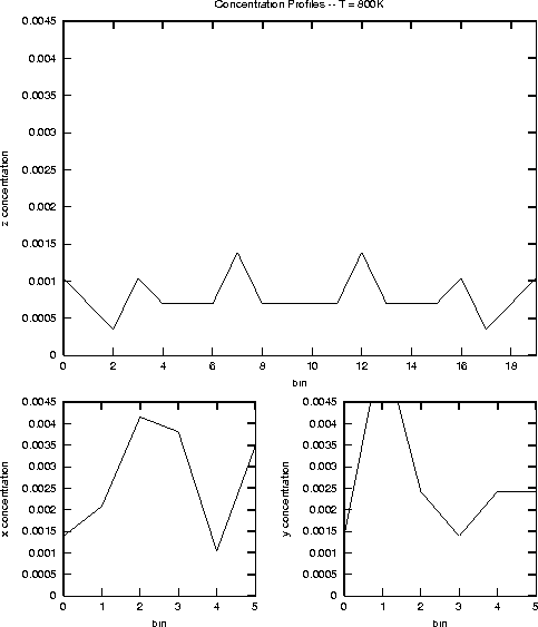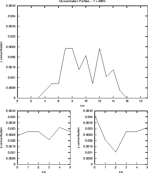 For T=800K a slightly different behavior is seen in the z-concentration. In this case the peak structure found is closer to being constant as opposed to the sharply peaked results for the lower temperatures. This is due to the larger fluctuations in energy allowed at the higher temperature.