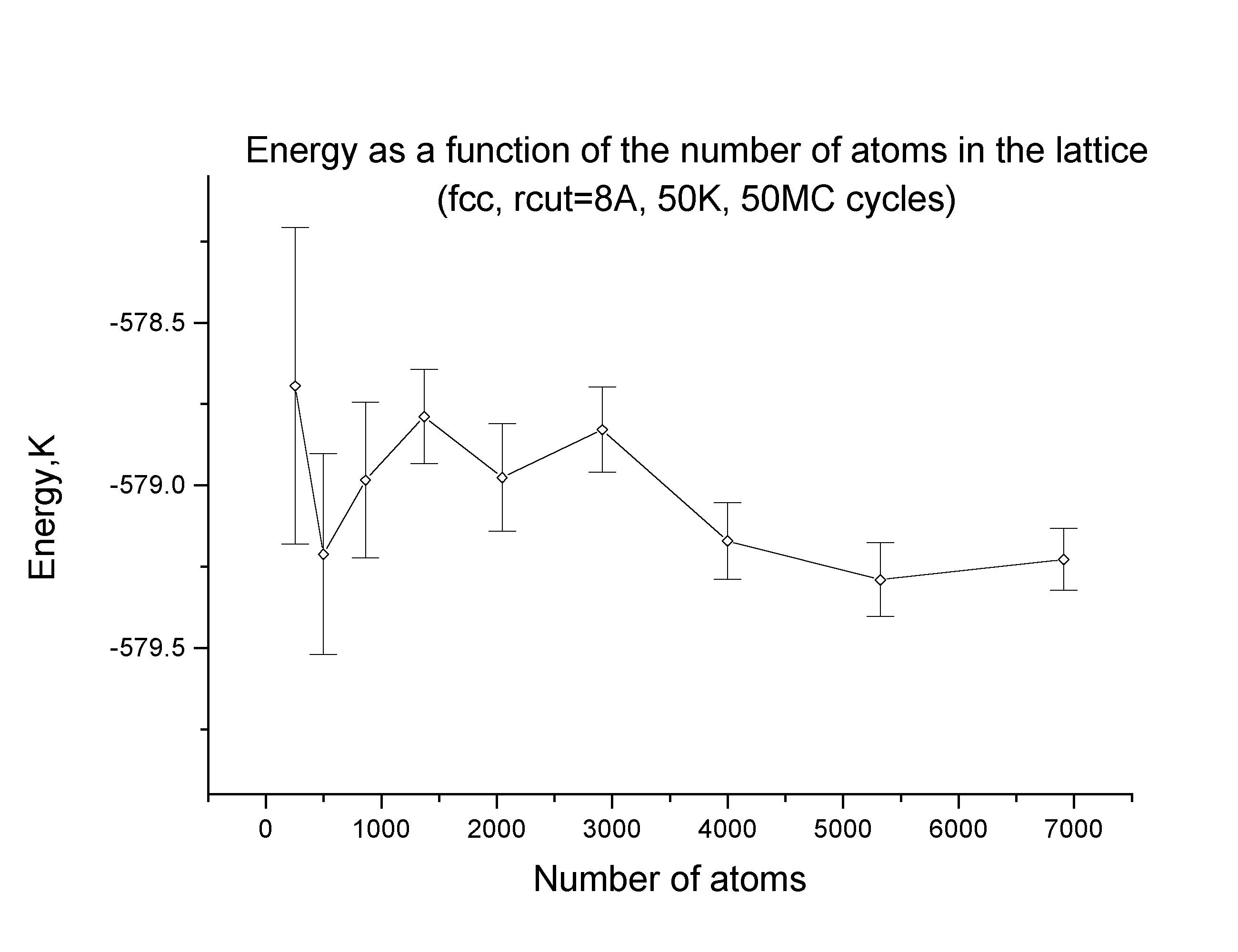 The simulation cell was taken to include 4000 atoms, large enough to reasonably eliminate unphysical correlation effects. The following plot shows the energy's dependence on the number of atoms in the simulation cell.