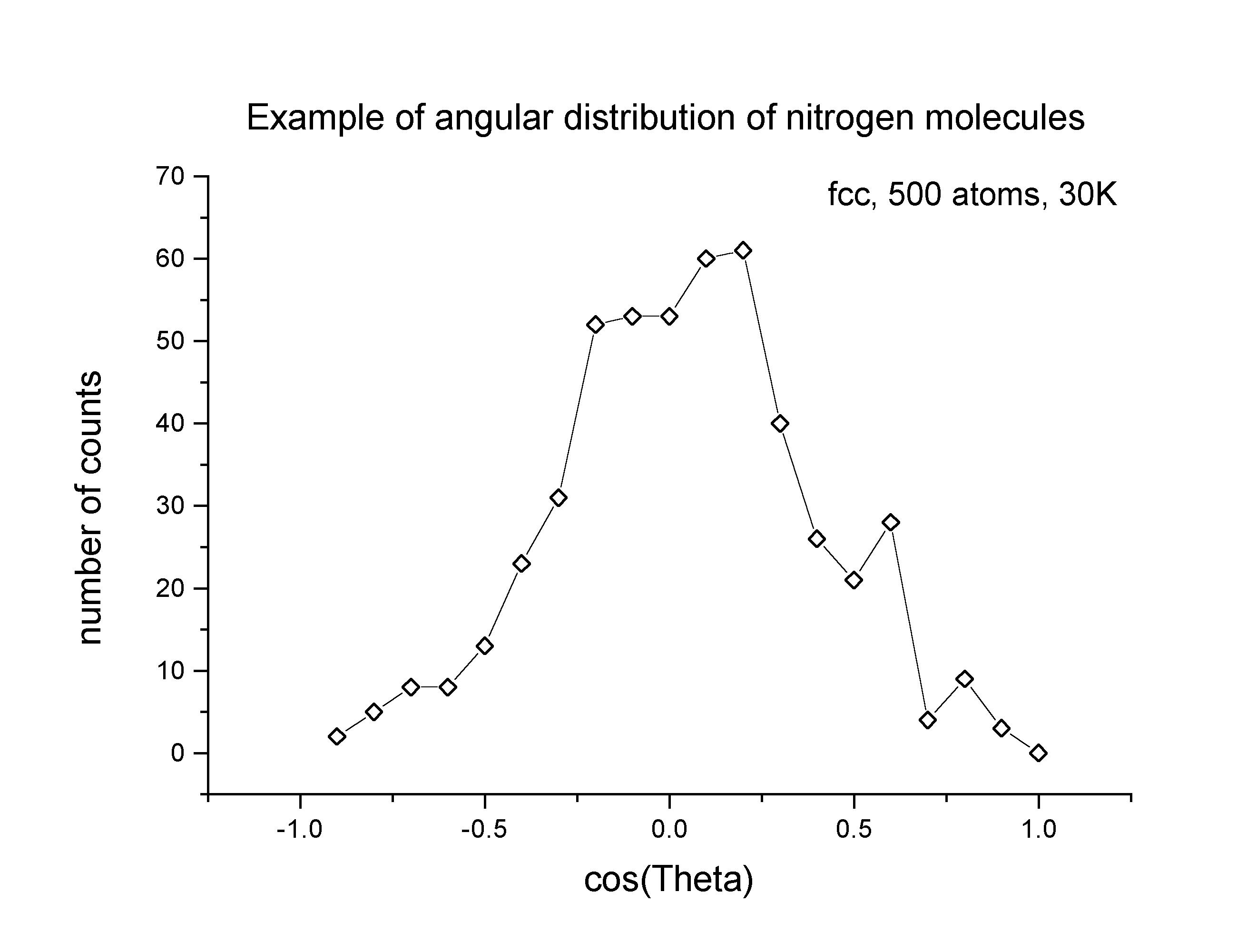With these approximations, the code took approximately 1 hour to run 200 Metropolis iterations per molecule on a DEC Alpha 500. While we would like to have taken a larger cut-off radius,we felt we could not afford the increase in required computer time. The resulting angular distribution at 30 K for the FCC phase shows that our simulation gave the proper orientational results for the FCC lattice, as seen below.