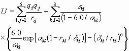 where the constants alpha, delta and epsilon are adjusted to fit. The indices i, j, k, and l refer to specific points along the axes of the pair of molecules. Point i refers to placement of fictitious electric charges of charge qi located on the axis of the first molecule, while point j refers to a similar point on the axis of the second molecule. This combination of electrostatic charges simulates the quadrupole and higher order electrostatic moments of the molecules. Points k and l perform similar functions in determining the attractive-repulsive van der Walls bonding between pairs of molecules. The physical extent of the molecules in the actual solid are on the order of the lattice constant, so the orientations have a big effect on the the size of especially Their relative positions determine the multipole moments and the strength of the van der Waals bonding in the potential.