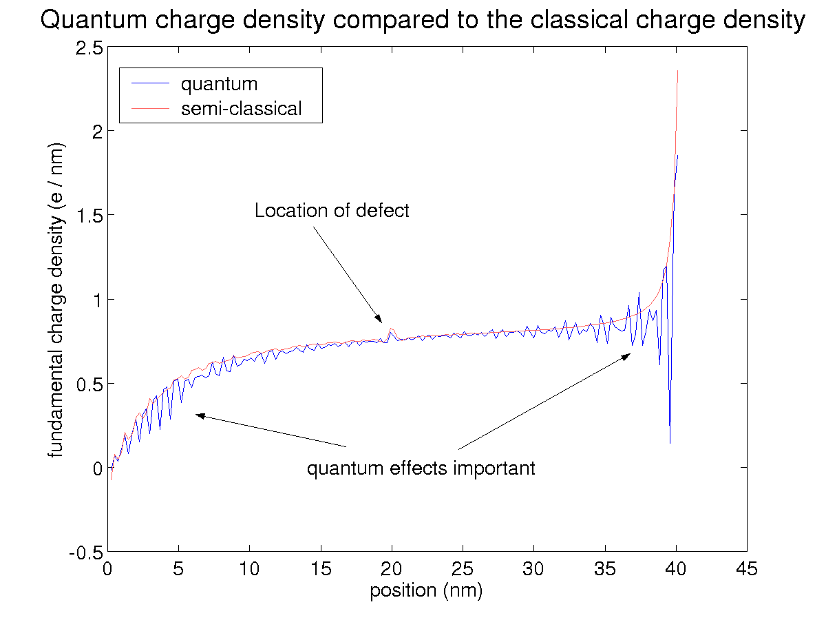 Below is the initial charge density distribution along the length of the nanotube, as computed by the quantum code. It is compared to a semi-classical solution.