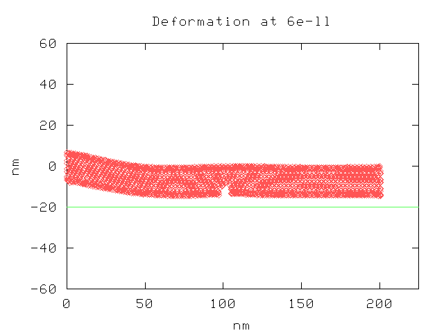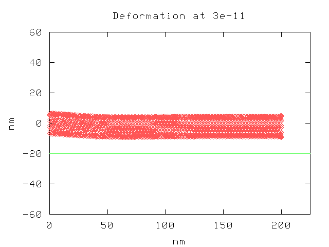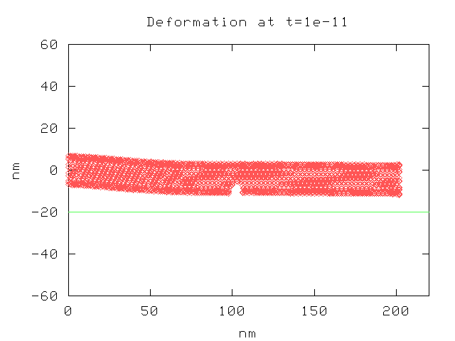 Here is a plot of the nanotube, as viewed from the side. It shows the deformation at 1e-11 seconds under a voltage difference of 5.0 V. The location of the graphite plate is shown by the green line.