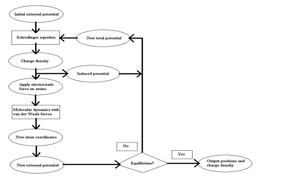 The quantum mechanical calculations involve two steps: calculating a numerical solution to the one-dimensional time-independent Schrodinger equation that describes the free electrons in the nanotube, and finding a numerical solution to the Poisson equation in the region of the switch. Each step is dependent on the other and so the process is iterated until a reasonably self-consistent potential is obtained. The calculations are initialized by considering only the external field in the initial potential, and the updated potential from the Poisson equation is used on subsequent steps.