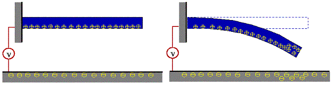 We have adopted a simple model of an electromechanical nanoswitch [2] as seen below, which consists of a carbon nanotube attached to an electrode at one end and suspended over another electrode (actually a graphite plate). A voltage difference is maintained between the nanotube electrode and the plate, which creates a nonuniform charge density distribution along the length of the nanotube. This charge distribution causes the nanotube to deform under the influence of the electric field.