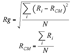 The radius of gyration of a polymer is defined as the average distance of monomers from the center of mass of the polymer.  Since the monomers used in this simulation all have the same mass, the center of mass is simplify the average position of all monomers.